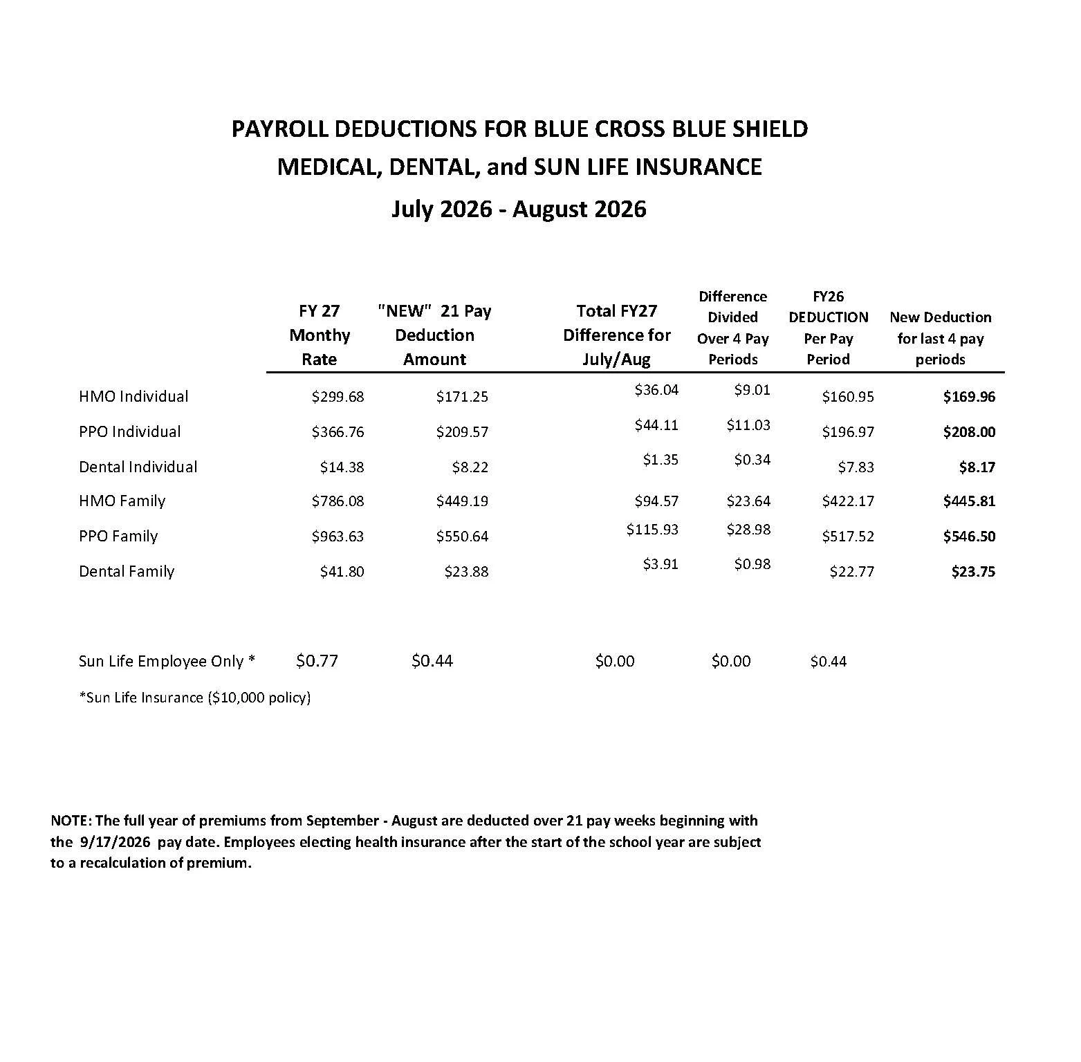 SWCEC does not deduct health premiums over July & August. The last 4 paychecks of the school year (5/13/2027 - 6/24/2027) will increase to reflect the difference in the new monthly rate.